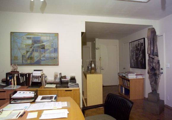 Clara Diament Sujo’s work desk. On the wall, Hedda STERNE (1910-2011), NY, NY No. X (oil on canvas, 835 × 1185 mm) Tate Gallery, London (Presented by Clara Diament Sujo); right, Stephen DE STAEBLER (1933-2011), Stele VI, 1995 (bronze, 2223 x 394 x 394 mm).
